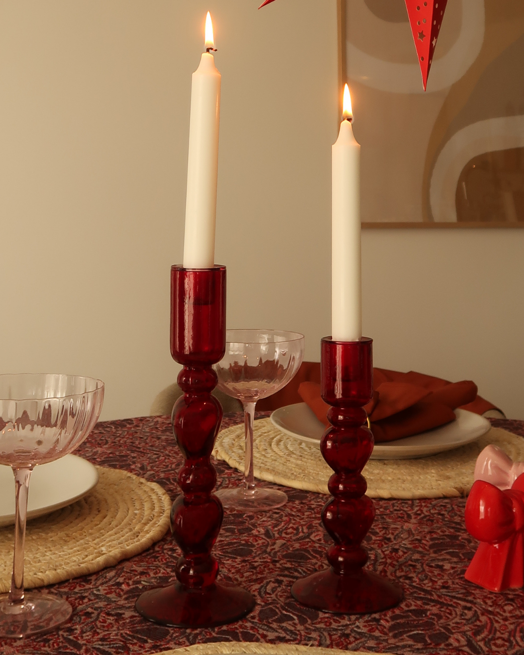 Deze prachtige kaarsenstandaard is een sfeervol decoratie-item. Gemaakt van rood glas en versierd met subtiele hartjes. Of het nou valentijn is of niet, deze kaarsenstandaard zorgt direct voor romantisch licht en voegt wat liefde toe aan je interieur.