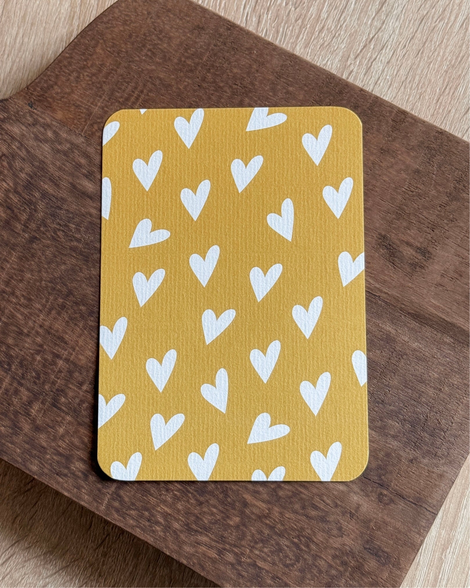 Leuke kaart met hartjes in een gele mosterd kleur. A6 kaartje met envelop